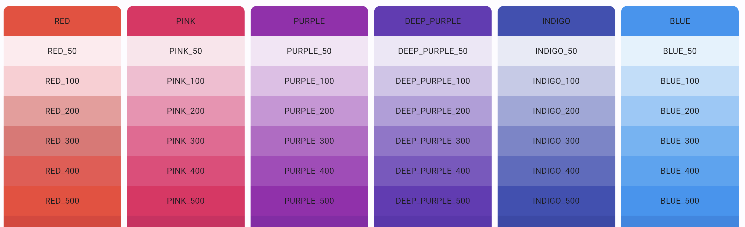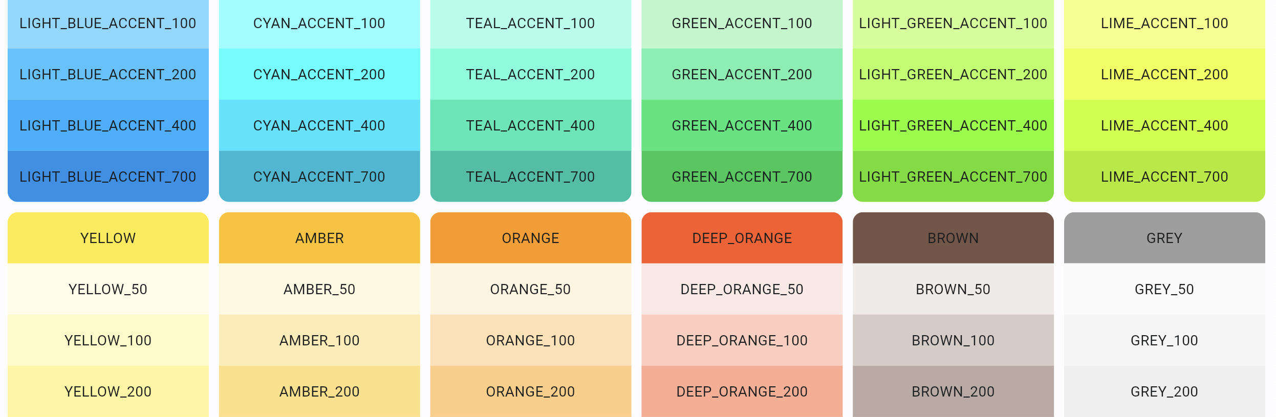 Each color swatch (palette) includes multiple shades of a specific color, where lower numbers represent lighter shades and higher numbers represent darker ones. Most palettes range from 50 to 900, in increments of 100, while accent swatches (e.g., Colors.RED_ACCENT) have only 100, 200, 400, and 700.