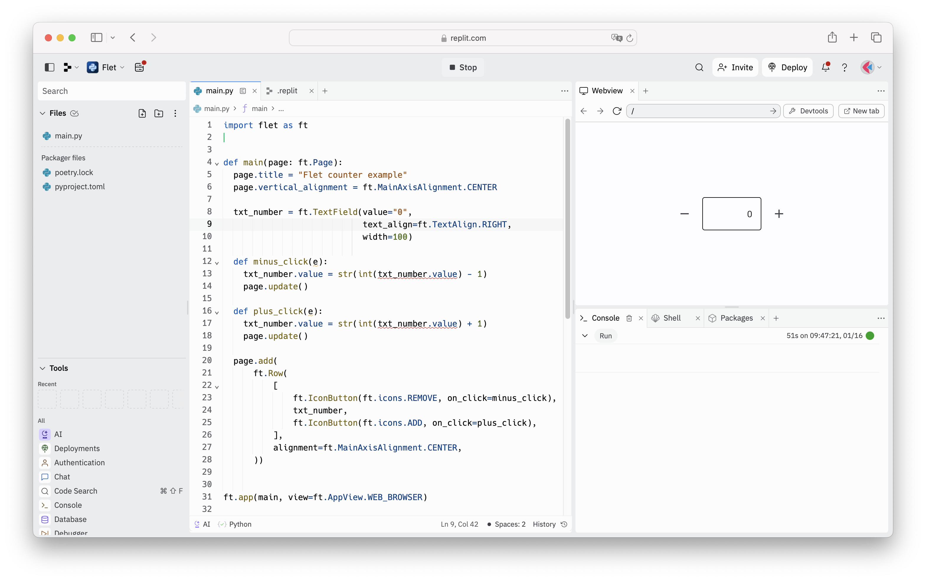 my-flet-app. Alternatively, go to Flet template page and click Use Template button. Flet template has everything configured for you, so you can jump tomain.pyand update your program right away. -